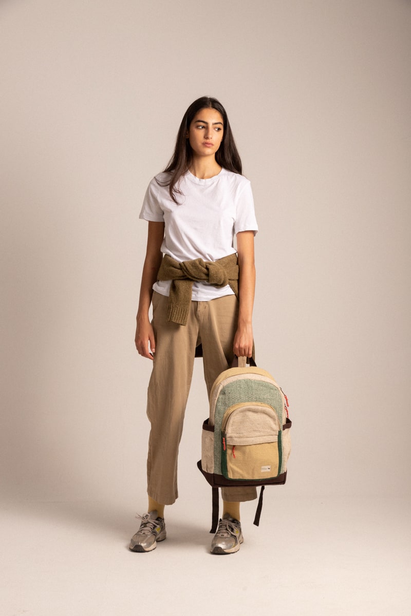 Plant-based dyed hemp and cotton fabric made in the looms of Mohan. This backpack was handmade in Narendra’s workshop.