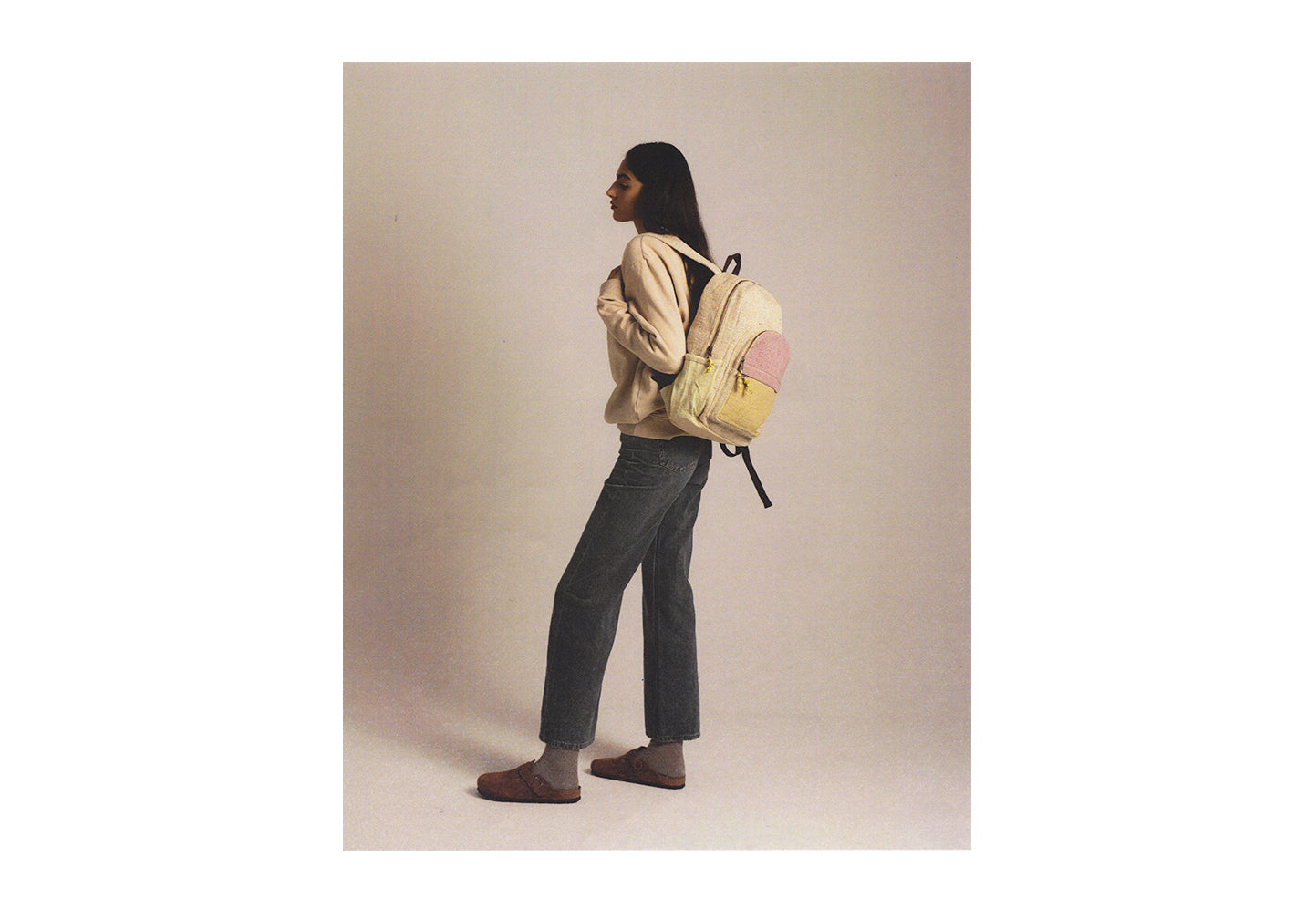 Plant-based dyed hemp and cotton fabric made in the looms of Mohan. This backpack was handmade in Narendra’s workshop.