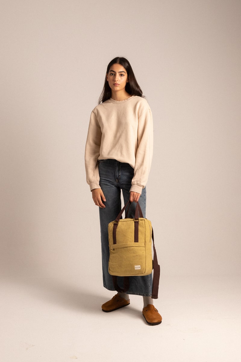 Hand-sewn plant-based dyed hemp backpack. All of the handles are handmade, using a Pokhara traditional technique. Five outer pockets with coconut buttons and a inner one to fit a laptop up to 15". The logo is stamped manually both inside and outside with a wood stamp, what makes the backpack unique.