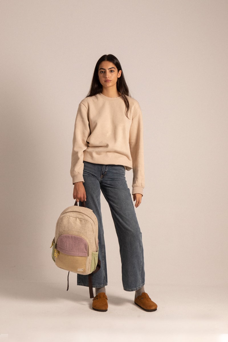Mochila de cáñamo y algodón hecha a mano. La mochila cuenta con un bolsillo interior para portátiles de hasta 15 pulgadas. La mochila tiene tres bolsillos exteriores, uno a cada lado y un tercero más grande en la parte frontal.